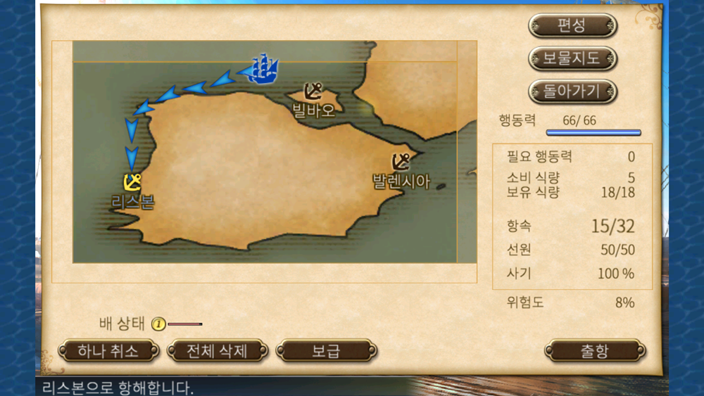 보르도는 리스본 바로 위 해도에서 보르도, 낭트, 목적지인 거점 순서