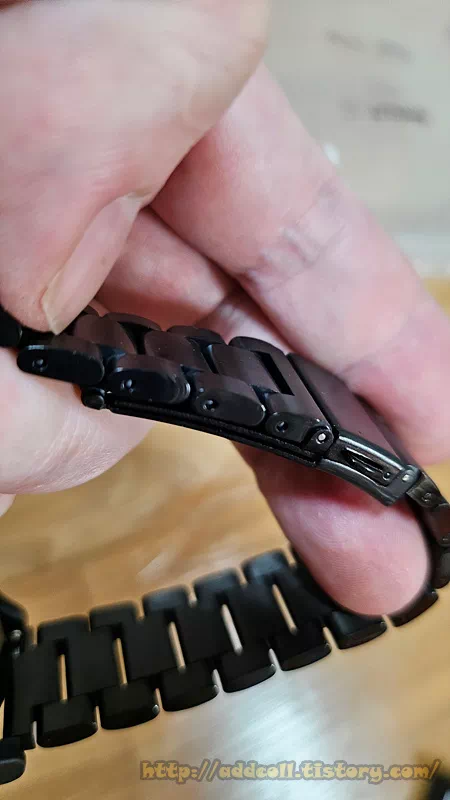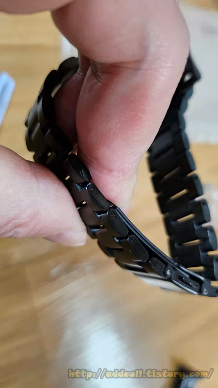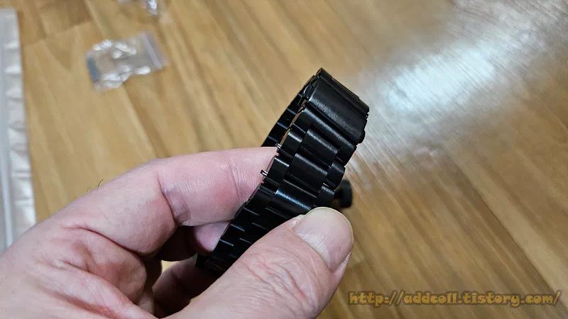 스테인리스 재질의 시곗줄은 도장도 잘 되어있고 촉감도 좋으며 마감도 아주 깔끔하여 이 가격대의 제품이 맞나 싶을 정도로 퀄리티가 좋습니다. 시계와 연결하는 방식은 워치 6 이전에 사용하던 힌지 방식으로 여분으로 하나가 더 들어 있어 총 3개의 힌지가 들어 있습니다.