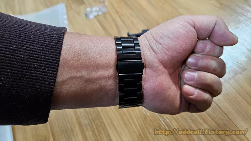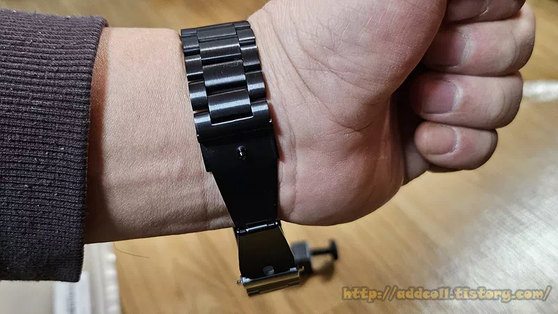 시계 길이 조절이 힘들고 이전 사용하던 제품들에 비해서 무거운 편이며, 체인처럼 마디가 있어 적응 전까지는 착용감이 살짝 불편한 감이 있습니다.
