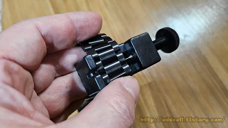 전용 도구에 시곗줄을 놓고 살짝 들어간 쪽을 뾰족한 핀 이 있는 쪽으로 맞추고 손잡이 돌로 면 힌지를 반대쪽으로 밀려나게 됩니다.