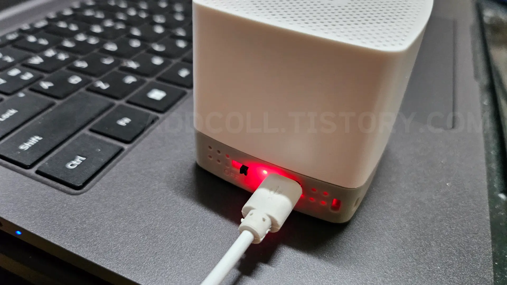 충전 중에는 후면에 빨간 램프가 들어옵니다. 재생 중에 충전도 가능합니다.