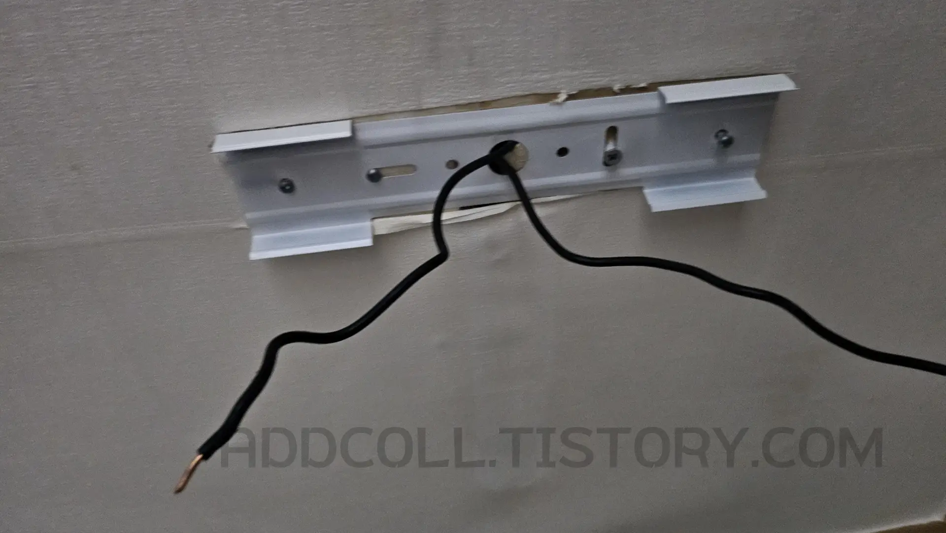 가운데 구멍으로 선을 빼주고 나사를 사용하여 브라킷을 천장에 고정하는 과정에서는 세심한 주의가 필요합니다. 석고보드나 얇은 나무판으로 된 천장은 쉽게 손상될 수 있으므로 특히 조심해야 합니다. 적당한 힘으로 조이되, 너무 강한 힘을 가하지 않도록 주의해야 합니다. 힘이 들어간다 싶으면 나사를 조이는 것을 멈추는 것이 좋습니다. 이렇게 함으로써 나사가 헛도는 것을 방지하고 천장을 손상시키지 않을 수 있습니다.
