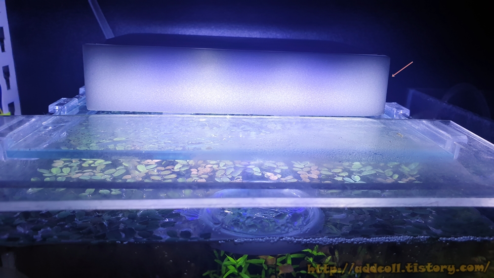 거의 뚜껑 수준이라 작업할 때마다 조명을 분리하는 귀찮음은 있겠구나? 그래도 괜찮네~ 했는데, 살짝 빛이 눈을 피곤하게 합니다. 제가 조금 예민한 건지, 어항 위치까지 딱 제가 자주 보는 쪽 바로 옆이라 은근히 빛이...